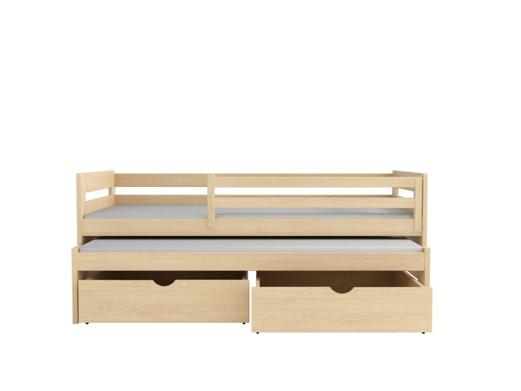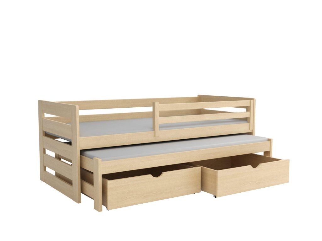 Masivní dřevěná postel s výsuvným lůžkem na spaní pro druhou osobu. Je to skvělé řešení jak pro rodiče, kteří chtějí být v noci dětem nablízku, tak i pro sourozence nebo návštěvu.