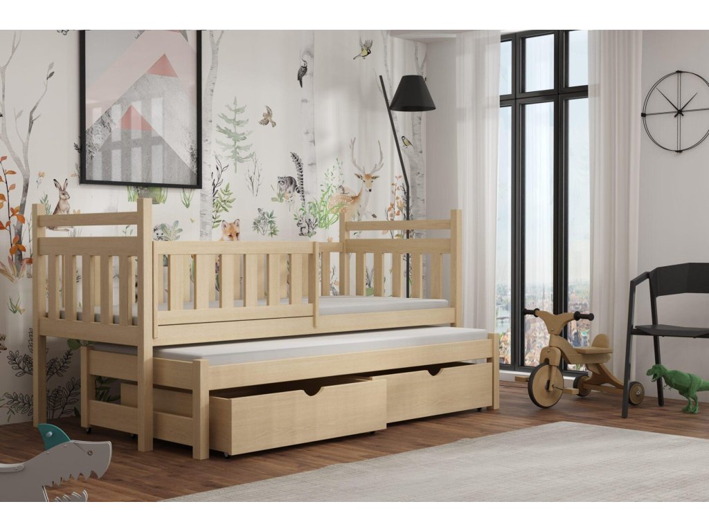 Masivní dřevěná postel s výsuvným lůžkem na spaní pro druhou osobu. Je to skvělé řešení jak pro rodiče, kteří chtějí být v noci dětem nablízku, tak i pro sourozence nebo návštěvu.